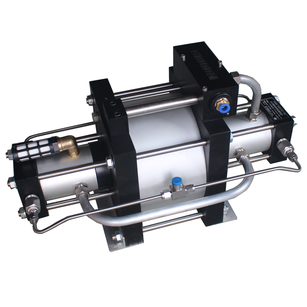 2、DTD系列增壓泵是單級泵,為達到所需壓力氣體輸入口輸入氣壓需要一定程度的預增(≥2Mpa),預增壓力因達到的最大壓力不同而不同。最大可增壓至120Mpa。該系列泵換向方式與DTA系列氣體增壓泵完全相同,不同之處在于該系列泵是在DTA氣體增壓泵系列基礎上制造的雙頭泵,同樣增壓比的情況下,比DTA流量高出1.5-2倍,適用于壓力高,用氣量大等情況下,整臺增壓裝置全部采用鋁合金及不銹鋼制造。它的驅動活塞直徑為160mm(200mm),驅動氣壓≤8bar,兩端泵頭均帶有排氣冷卻。出廠時兩入口及兩出口可按用戶要求連接好管路。
