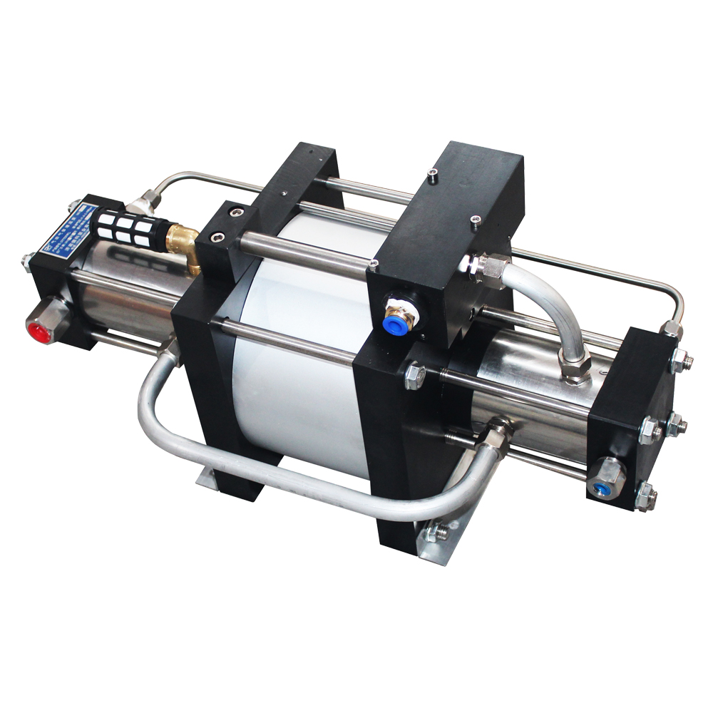 3、DTT系列氣體增壓泵可以將極低壓力的氣體(0.2-0.8Mpa)增至很高的壓力(0-120Mpa),驅動氣壓≤8bar,驅動氣體輸入口的壓力范圍為0.5—10bar,最大可增至800 Bar。該系列氣體增壓泵的換向方式與DTA系列完全相同,整臺泵全部采用鋁合金及不銹鋼制造,重量在20kg左右。