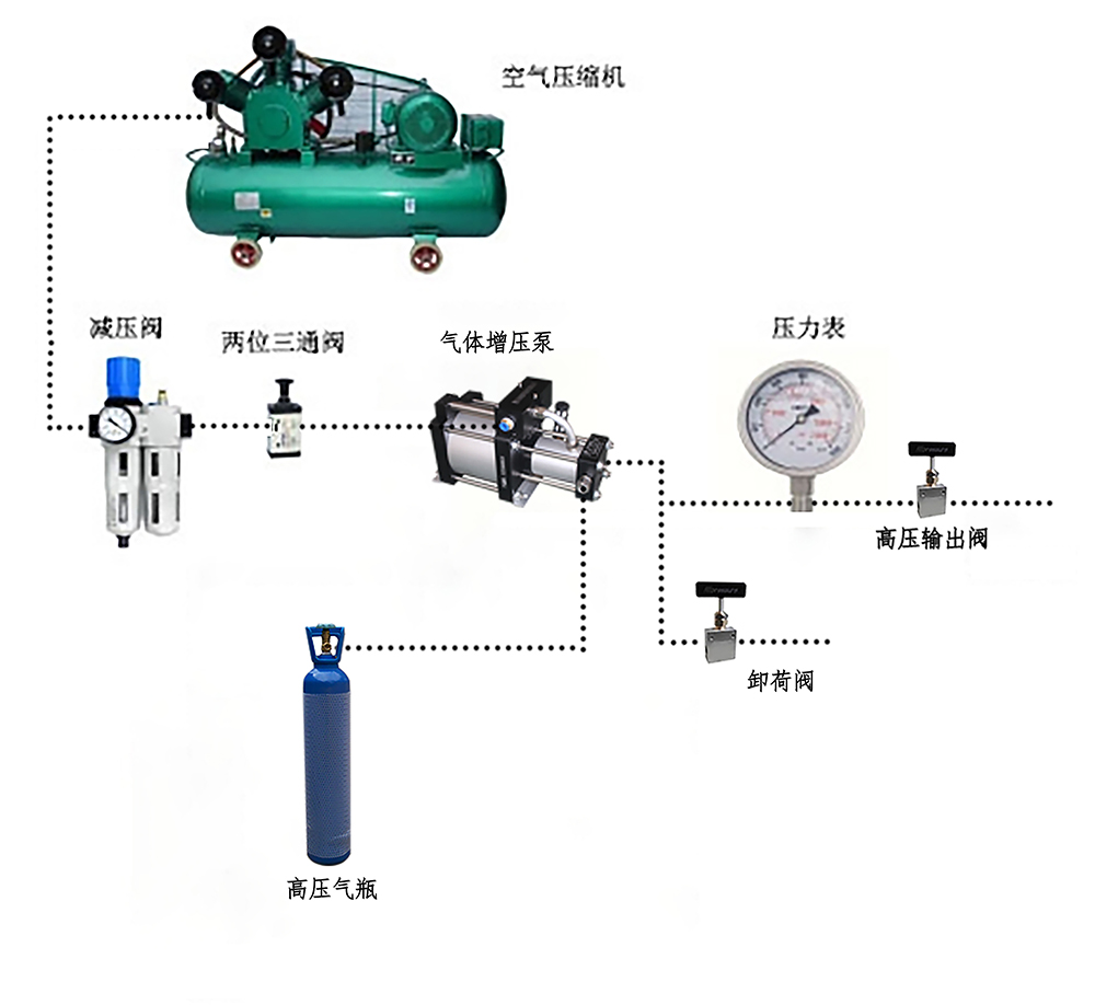 二級增壓泵可以將極低壓力的氣體增至很高的壓力,驅(qū)動氣壓≤7bar,氣體輸入口的壓力范圍為1—10bar,最大可增至90Mpa。該系列泵的換向方式與一級增壓泵完全相同,整臺泵全部采用鋁合金及不銹鋼制造。